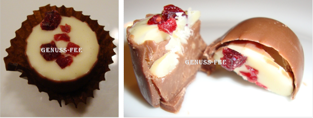 Vollmilchganache mit Kirsch-Cranberry-Geschmack umhüllt von leckerem Vollmilchtöpfchen.