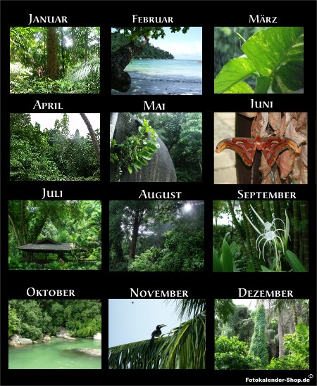 Dieser Regenwald Kalender enthält asiatische Motive. Die Fotos wurden im Dschungel Malaysias gemacht. Der Kalender zeigt neben Tieraufnahmen auch Pflanzen in Großaufnahme, sowie Buchten und eindrucksvolle Plätze des Regenwaldes.