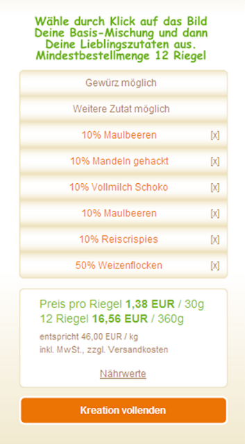 Ich habe mir einen eigenen Riegel kreiert und vor ein paar Tagen erhalten. Mindestabnahme sind 12 Stück. Der Preis variert je nach Zutaten die gewählt werden. Die Versandkosten (AUT) betragen 7,90 Euro.