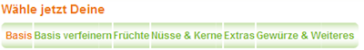 Es gibt eine rießengroße Auswahl an Zutaten. Die Zutaten werden nach der Reihe nach ausgewählt, begonnen wird mit der Basis und dann geht’s weiter.