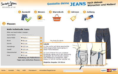 Smart-Jeans erstellt Jeans nach Wunsch und Maß. Schnell habe ich meine Wünsche ausgewählt (Modell, Farbe, Naht-Farbe, usw.) und dann gings ans Messen. Beim Messen hatte ich etwas Hilfe, doch auch dies ging dank der Abbildungen auf der Homepage ziemlich einfach.