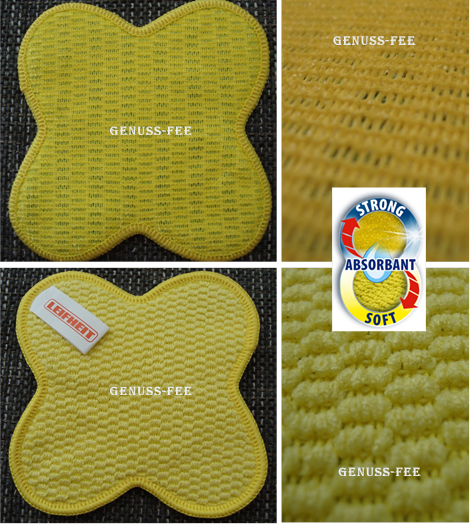 Ein Tuch zwei Funktionen: Die weiße Seite reinigt gründlich, die gelbe trocknet streifenfrei.