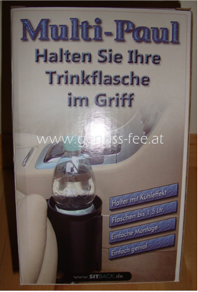 Multi-Paul ist ein Multi-Funktionsbehälter für das Auto, welcher ganz einfach montiert und demontiert werden kann. Er kann als Flaschenhalter (für 3/4 l – 1,5 l Flaschen), als Abfalbox oder zum Aufbewahren diverser Utensilien verwendet werden. Weiters verzögert er bei warmen Temperaturen das Aufheizen der Trinkflasche und im Extrem-Fall kann das Luftkissen auch als gewöhnliches Kissen verwendet werden.