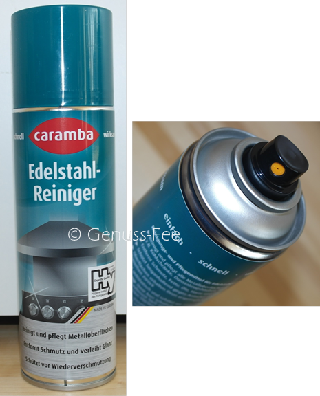 Ich habe zuvor immer die Dr. Beckmann Edelstahl Schutz & Pflege verwendet. Sie ist zwar in der Anschaffung teurer – jedoch kommt man mit dem FlĂ€schchen sehr lange aus, da eine winzig kleine Menge zum Reinigen reicht. Das Ergebnis ist um eine Spur besser als mit dem Caramba Edelstahl Reiniger. Ich habe versucht das hier auf dem Foto festzuhalten:
