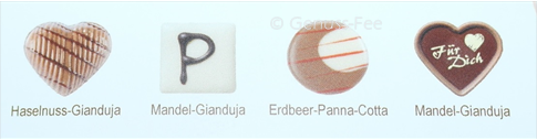 Bei den Pralinen können diverse Mixe ausgewählt werden. Nämlich „Alles Frucht„, „Grande Auslese„, „Herz-Edition“ und „Sinnlich nussig„.