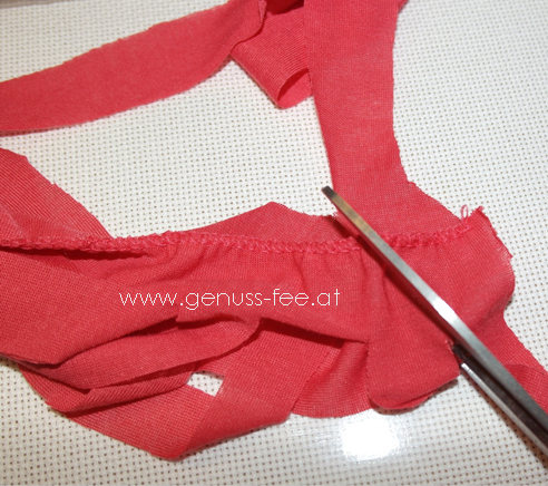 – Nun beginnt man jeweils ca. 1 cm breite (wer möchte auch breitere) Streifen von der geschlossenen Seite weg bis KURZ VOR Ende der offenen Seite zu schneiden.