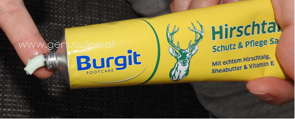 Den Burgit Hirschtalg verwende ich gerne abends, wenn ich es mir entweder vor dem Fernseher oder mit einem Buch bequem gemacht habe, denn der Hirschtalg zieht nicht ganz so schnell ein. Es braucht schon ein Weilchen. Zudem hält er die Haut auch bei starker Beanspruchung weich und geschmeidig. Daher auch perfekt für länger andauernde Feste, Partys, etc. in nicht ganz so bequemen Schuhen, da die Creme auch Blasen und Reibung entgegen wirkt. Bei solchen Festivitäten dürfen auch die Blasenpflaster von Burgit in meiner Tasche nicht fehlen. Denn sollte sich trotzdem mal wo eine Blase bilden, lindern diese SOFORT den Schmerz und man kann problemlos weiterfeiern, -tanzen, etc. Auch bei längeren Wanderungen spitze. Dazu kommt noch dass die Blase schneller wieder abheilt.