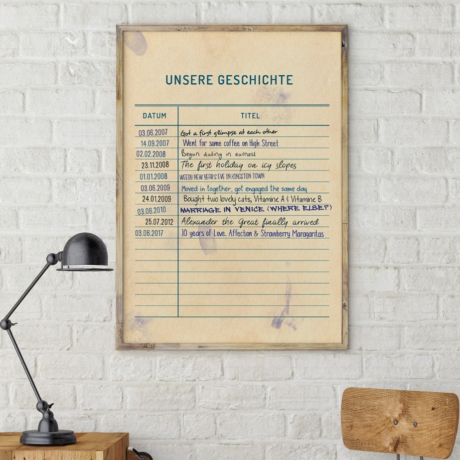 Die charmante Gedächtnisstütze für gemeinsam Erlebtes. Kein Vergessen mehr von Geburtstagen, vom Jahresstag, vom Hochzeitstag, etc. denn so hat man alles auf einem Blick. Künftige Ereignisse können handschriftlich ergänzt werden. Bereits bekannte Daten werden gleich direkt auf das Poster gedruckt.