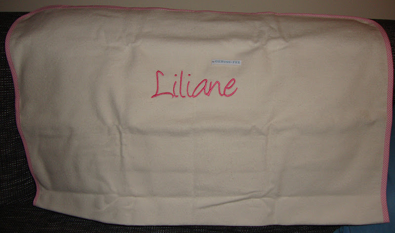 Ich habe mich für die Babydecke „Kuschelweich“ in der Moltonfarbe Natur entschieden mit einem rosafarbenen Vichy-Karo-Band. Bestickt wurde die Decke mit dem Namen Liliane in der Farbe Rosa.