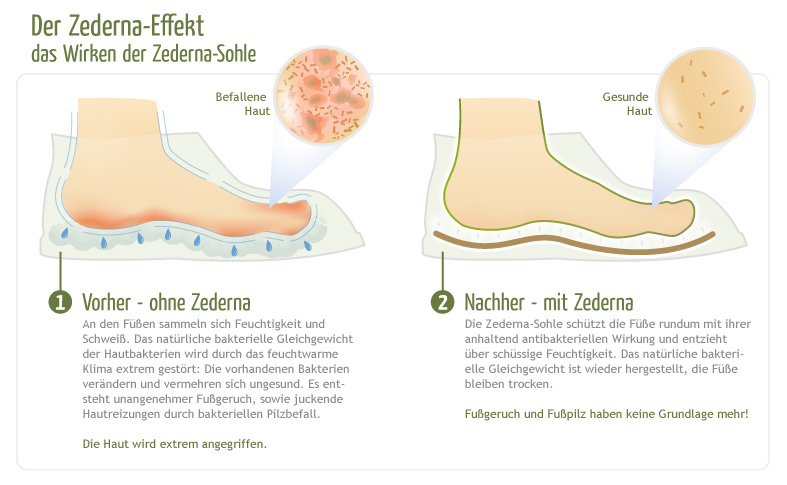 Die antibakterielle Eigenschaft der Zederna Sohle macht die geruchs- und pilzbildende Hornhautbakterien unschädlich.