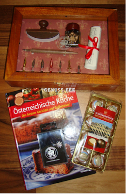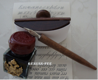 Die Federbox ist ein echter Hingucker und eignet sich auch bestens als Geschenk. Als ungeübte Schreiberin habe ich etwas gepatzt (wie man auf der Abbildung sieht), es macht allerdings Spaß mit der Feder und dem Tintenfass zu schreiben.