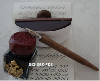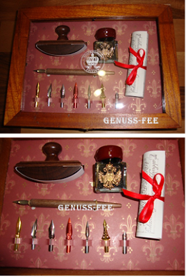 Die Federbox ist ein echter Hingucker und eignet sich auch bestens als Geschenk. Als ungeübte Schreiberin habe ich etwas gepatzt (wie man auf der Abbildung sieht), es macht allerdings Spaß mit der Feder und dem Tintenfass zu schreiben.