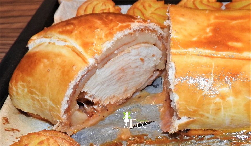 – Den Teig einrollen und die Enden fest zusammendrücken. Den Blätterteig mit Eigelb bestreichen und mit der Nahtseite nach unten auf das mit Backpapier ausgelegte Backblech legen.
